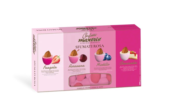 Confetti con mandorla tostata ricoperta di cioccolato bianco ai gusti assortiti (fragola, amarena, mirtillo, cheesecake) e da un sottile strato di zucchero.